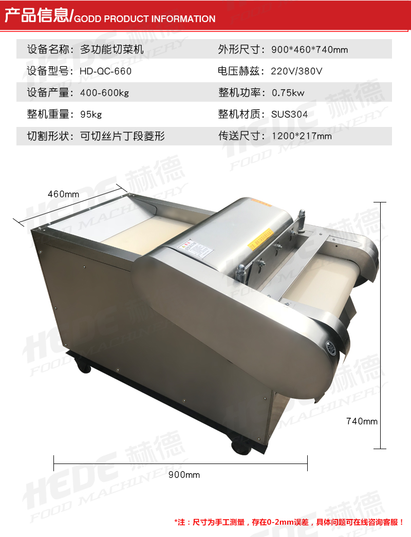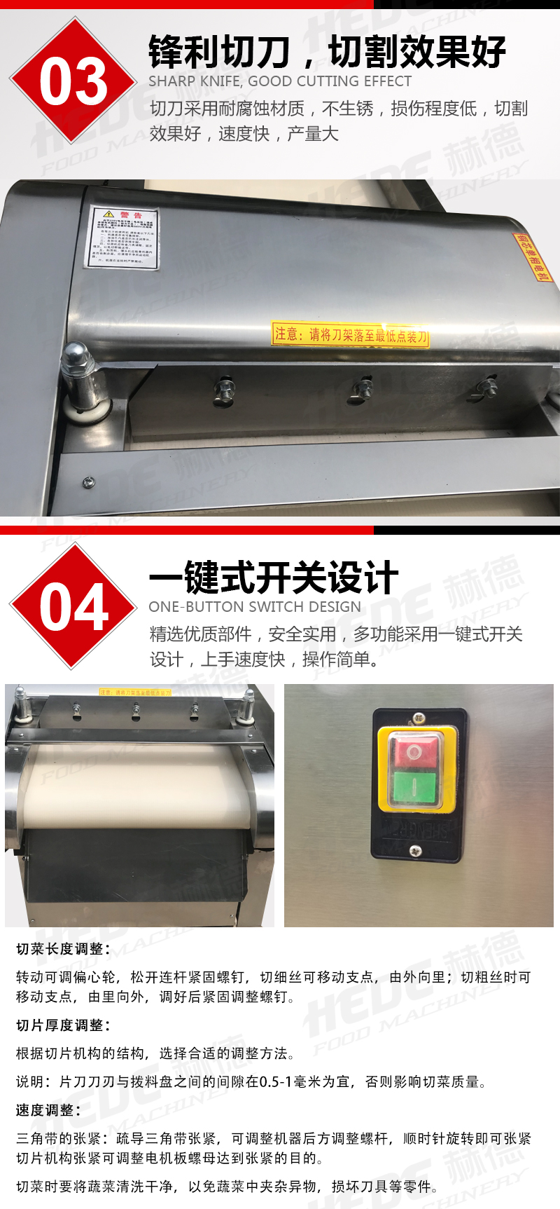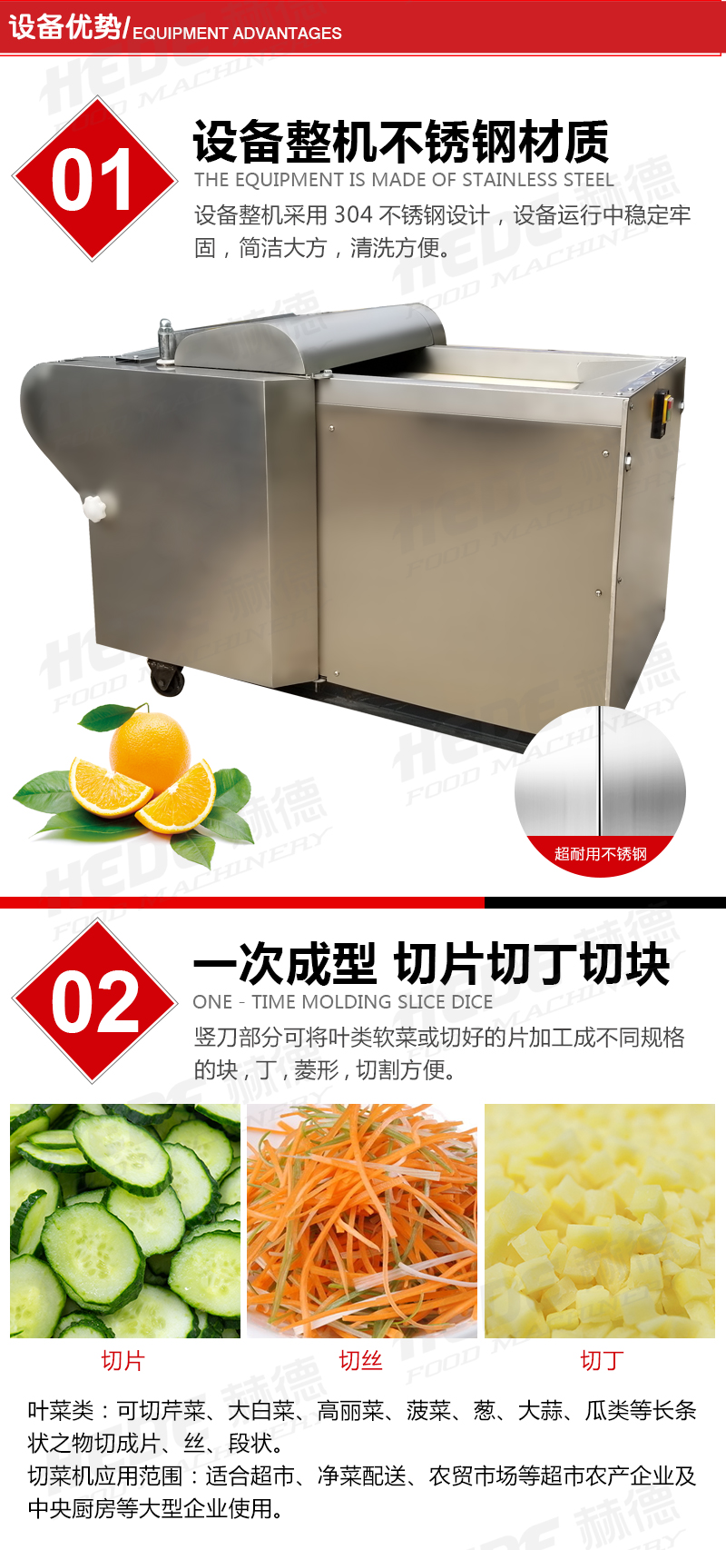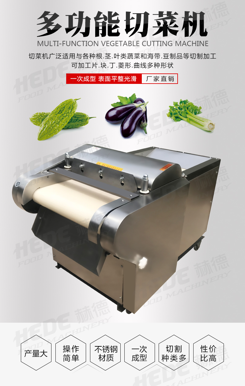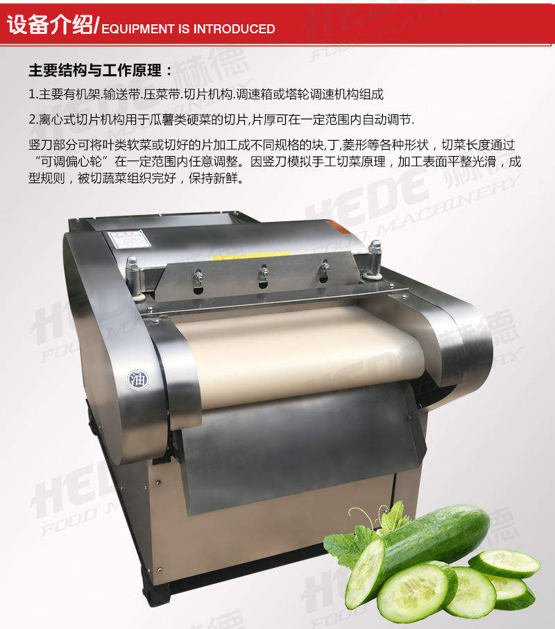 主要有机架,输送带,压菜带,切片机构,调速箱或塔轮调速机构组成。离心式切片结构用于瓜薯类硬菜的切片,片厚可在一定范围内自动调节。竖刀部分可将叶类软菜或切好的片加工成不同规格的块,丁,菱形等各种形状,切菜长度通过“可调偏心轮”在一定范围内任意调整。因竖刀模拟手工切菜原理,加工表面光滑平整,成型规则,被切蔬菜组织完好,保持新鲜。